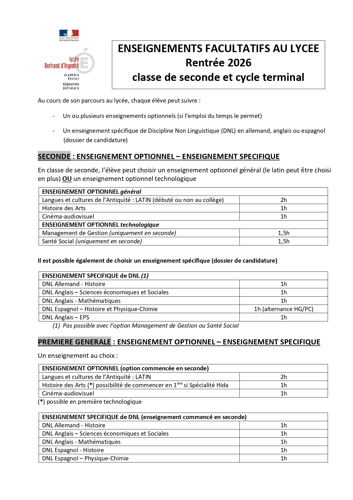 Les enseignements facultatifs rentrée 2026