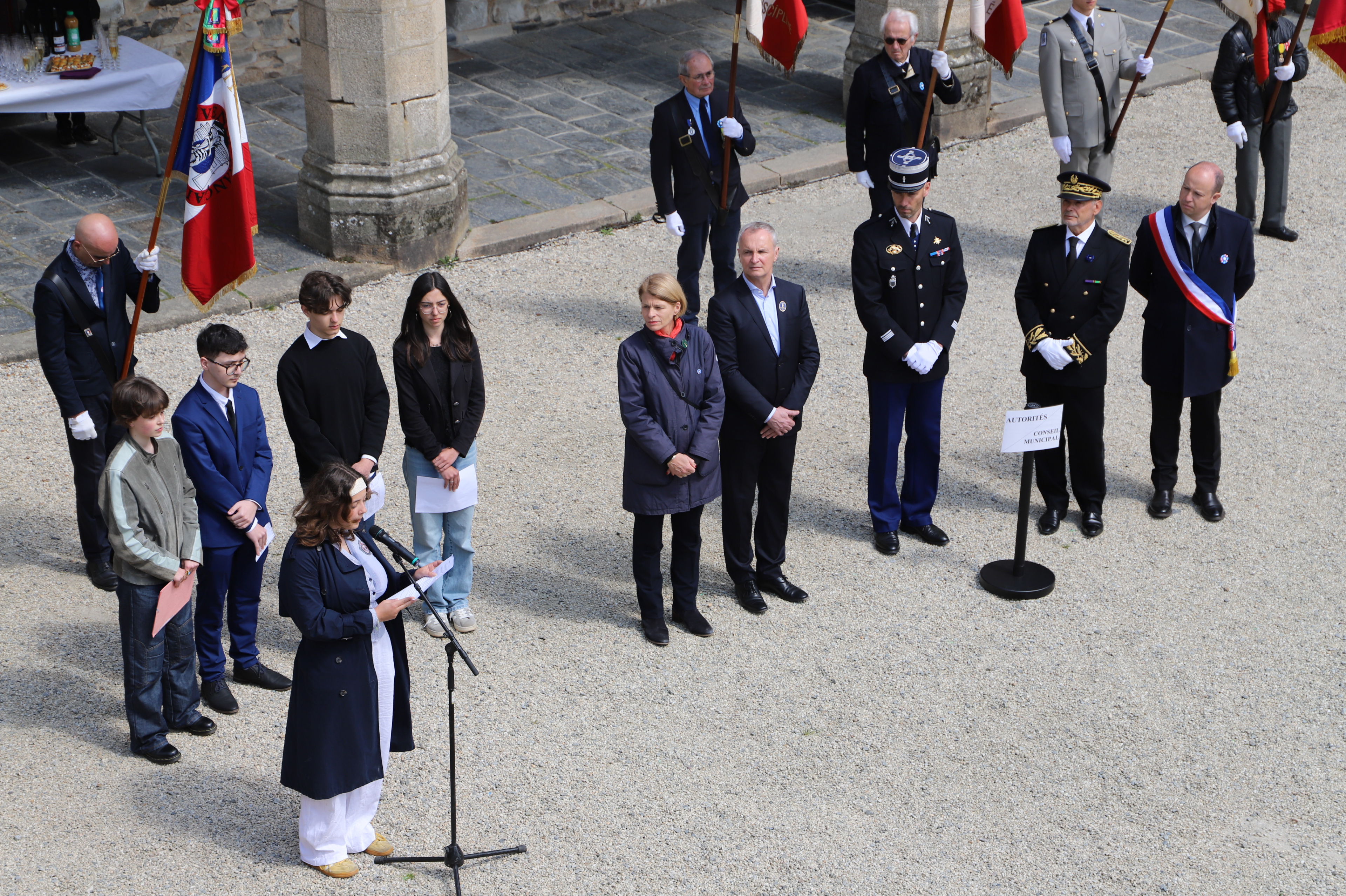 Zélie, Olga, Louis, Maëla et Léo lisent leurs textes lors de la cérémonie du 8 mai - crédit Ville de Vitré |